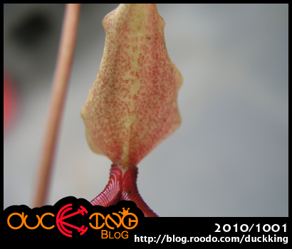 每次小鴨在花市擺攤的時候…都會聽到有民眾說豬籠草的瓶蓋會蓋起來的言論…其實豬籠草的瓶蓋是不會蓋上的…她們有兩個功能,其一就是分泌蜜汁吸引昆蟲,在捕蟲瓶的頂蓋上有著無數的細小紅點…這些是用來分泌蜜汁吸引昆蟲的蜜腺,其二就是用來遮蔽雨水落入袋中而沖淡消化液,所以囉~當昆蟲來吸食蜜汁不小心跌落捕蟲瓶中時…瓶蓋是『不會』有任何閉合的動作喔!這點一直是很容易被大家所誤會的啦~呱哈!