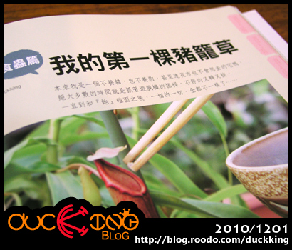 本書內寫得是否和食蟲植物有關呢?呱哈哈~答案當然是肯定的啦!因為鴨王也只會栽培食蟲植物而已啦~其他的植物鴨王可是種得一塌糊塗啦~呱嗚!不過啊!在談文章的內容之前…且容鴨王先聊聊為何要來撰寫雜誌文章囉?