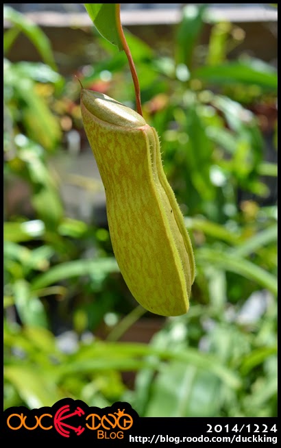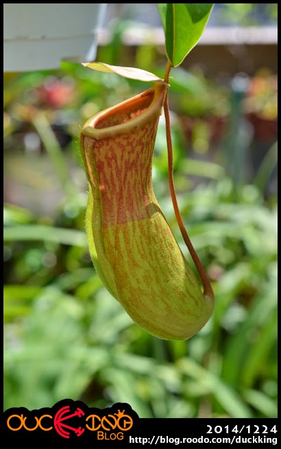 雖然小鴨王整理圖片時沒有找到小艾豬兒的花朵照…不過如果印象無誤的話…她應該也是一棵公豬啦!呱哈~上圖是還尚未開瓶成熟的捕蟲幼幼瓶!就算如此依舊能夠欣賞到那迷彩的花紋囉~