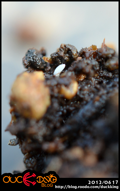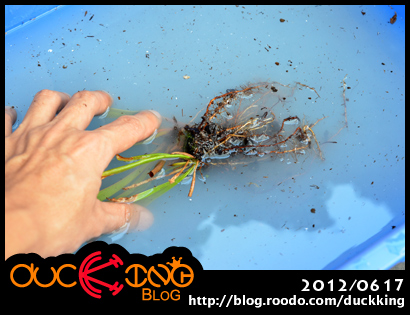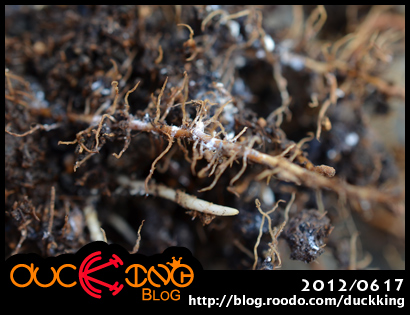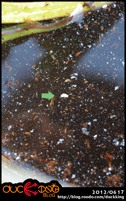 由於根粉介殼蟲會在土壤之中大量繁殖,所以一旦發現植株受到感染之後必需將其土壤和植株分離,並且清除掉這些已經被根粉介蟲污染的土壤避免重複使用!此外為了要讓藥劑直接碰觸蟲體確實驅離這些討厭鬼…在把多餘的土壤和植株分離清除之後,小鴨王通常都會先準備一桶清水來沖洗一下植株根部的餘土,只要將植株的根部浸泡在水中稍微搖晃一下,很快就可以看到一大片的白粉從根部漂浮起來,這時就可以輕易的看到不少根粉介蟲在水上不停掙扎喔!上圖中的綠色箭頭所指處就是其中一隻討厭鬼啦!呱哈~